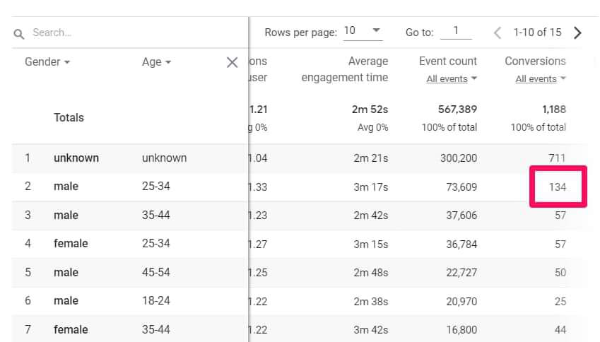 In het bovenstaande voorbeeld is de best presterende groep (wat betreft conversies) een man van 25-34 jaar oud. Dit geeft een beter idee van hoe je advertentie targeting kunt verfijnen. Zodra alle advertenties worden weergeven, zou het logischer zijn om vast te houden aan de gegevens die het advertentieplatform (bijv. Google Ads) verzamelt.