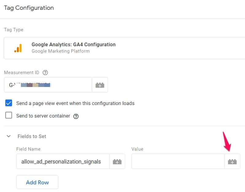 Noem deze variabele cjs – false en sla hem op. Deze variabele wordt dan automatisch ingevoegd als de waarde van allow_ad_personalization_signals.