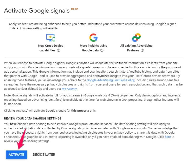 Als Google signals al is geactiveerd, zie je een tuimelschakelaar.