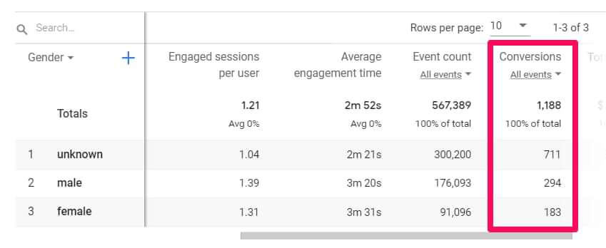 Bijvoorbeeld, in het rapport geslachten, kunt u de kolom conversies controleren (als je deze hebt geconfigureerd). Hier kan je vervolgens zien welke groepen beter converteren.