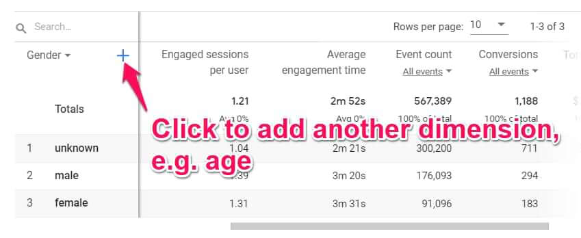 Je kan zelfs twee dimensies combineren in hetzelfde rapport. Stel bijvoorbeeld geslacht in als uw primaire dimensie. Klik vervolgens op het plusteken om leeftijd als secundaire dimensie toe te voegen.