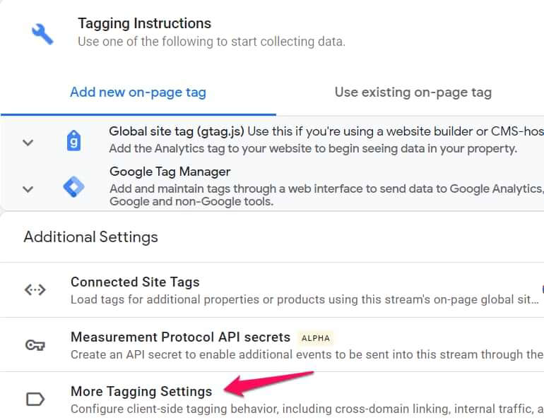 In Google Analytics 4 ga je naar Beheer → Gegevensstreams en selecteer jouw stream. Klik vervolgens op ‘Meer instellingen voor taggen’.