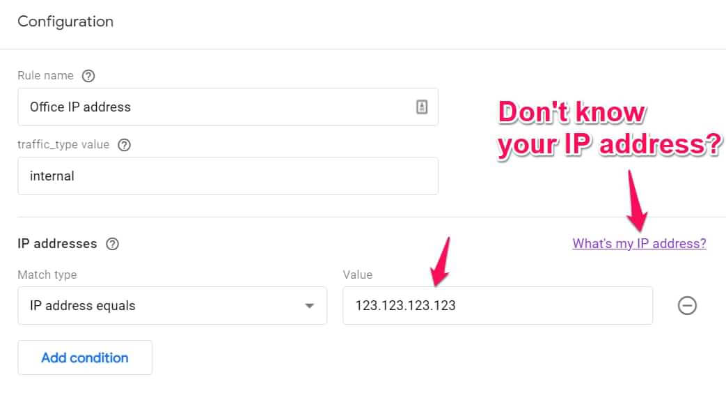 Laten we beginnen met de klassieker. Dit zou kunnen werken als er niet veel mensen betrokken zijn bij het runnen van een bedrijf en je hun hits eenvoudig kan uitsluiten op basis van hun IP-adres. Deze methode werkt niet goed als je veel verschillende IP-adressen moet invoeren of als sommige IP-adressen niet statisch zijn (lees: regelmatig wisselt).