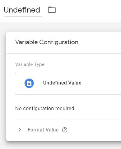 Maak eerst een ongedefinieerde variabele. In GTM, ga naar Variabelen → Nieuw →  Undefined (onder het kopje Pagina variabelen).
