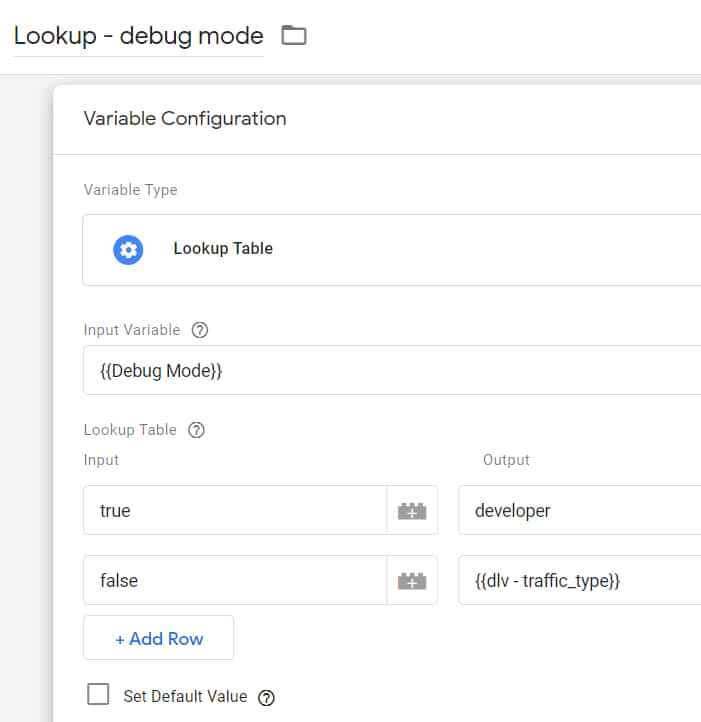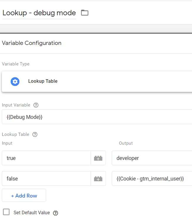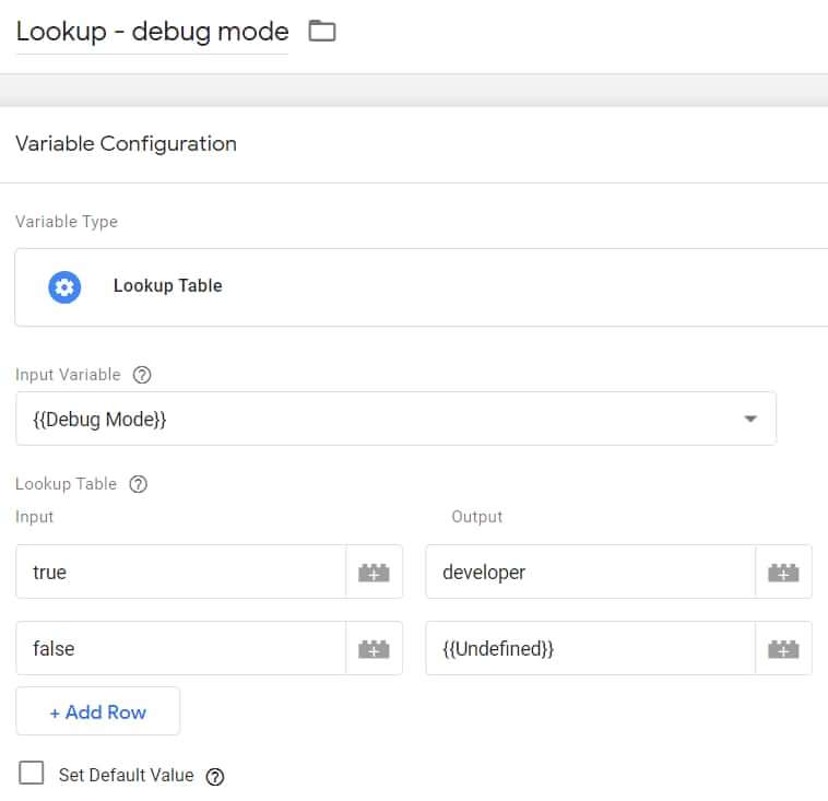 Hier gebruiken we de Debug Mode-variabele als invoer. Als de GTM voorbeeldmodus is ingeschakeld, retourneert deze variabele ‘true’, daarom retourneert de Lookup-tabel variabele het woord “developer”. Als de GTM voorbeeldmodus niet wordt gebruikt, retourneert de Debug Mode-variabele ‘false’, daaraan koppelen we de ‘undefined’ variabelen.