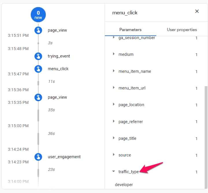 Allereerst, zou je hits moeten zien afkomstig van jouw apparaat. Klik op een willekeurige gebeurtenis in de gebeurtenissen stream en controleer the parameter traffic_type. De waarde moet ‘developer’ zijn.