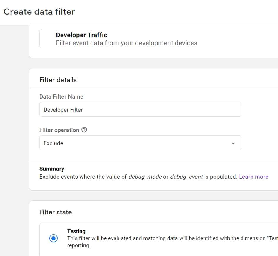 GA in GA4 naar Beheer → Gegevensinstellingen → Gegevensfilters → Filter maken. Kies Ontwikkelaarsverkeer. En gebruik de volgende instellingen.