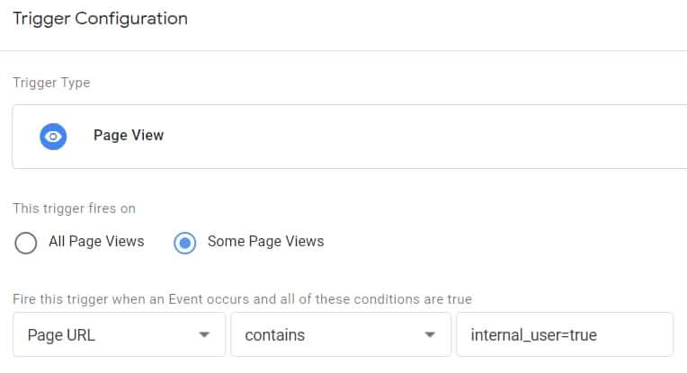 Stel deze tag in om te worden geactiveerd bij een paginaweergave-trigger wanneer de pagina-URL internal_user=true bevat.
