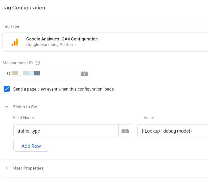 Ga ten slotte naar jouw Google Analytics 4-configuratietag en voer de volgende parameter in: traffic_type. En de waarde ervan zou de opzoektabel moeten zijn die je zojuist hebt gemaakt.