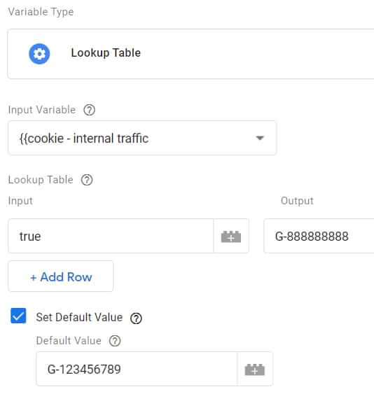 In principe kan je een Lookup-tabel variabele maken die de juiste GA4 measurment ID kiest op basis van een variabele die het intern verkeer kenmerkt. Laten we dus zeggen dat je een cookie-variabele hebt ‘Cookie – intern verkeer’ en de waarde ervan is “true” als de bezoeker een medewerker is.